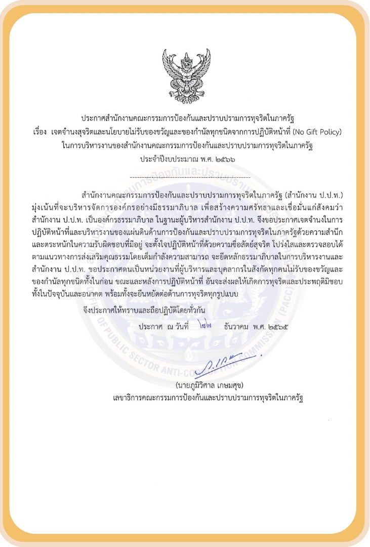 ประกาศสำนักงาน ป.ป.ท. เรื่อง นโยบายการไม่รับของขวัญฯ (No Gift Policy) ประจำปีงบประมาณ พ.ศ. 2569