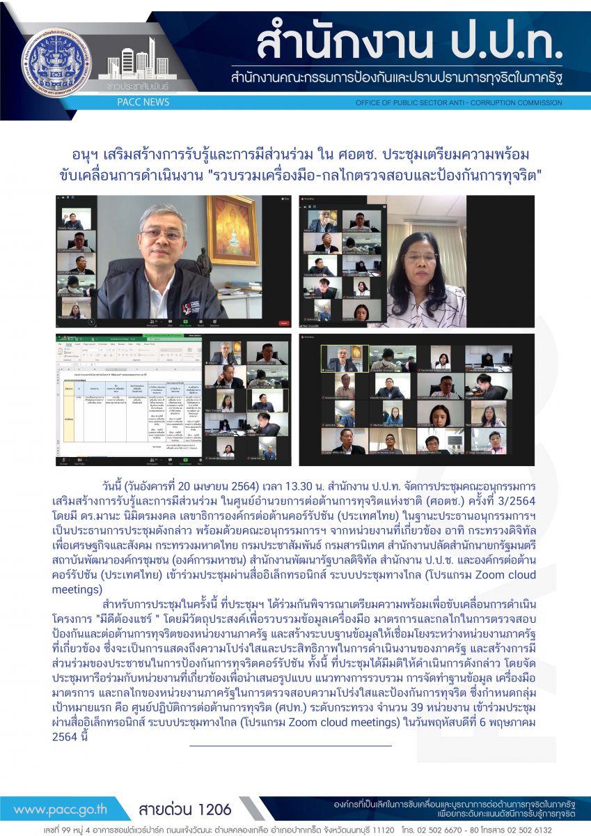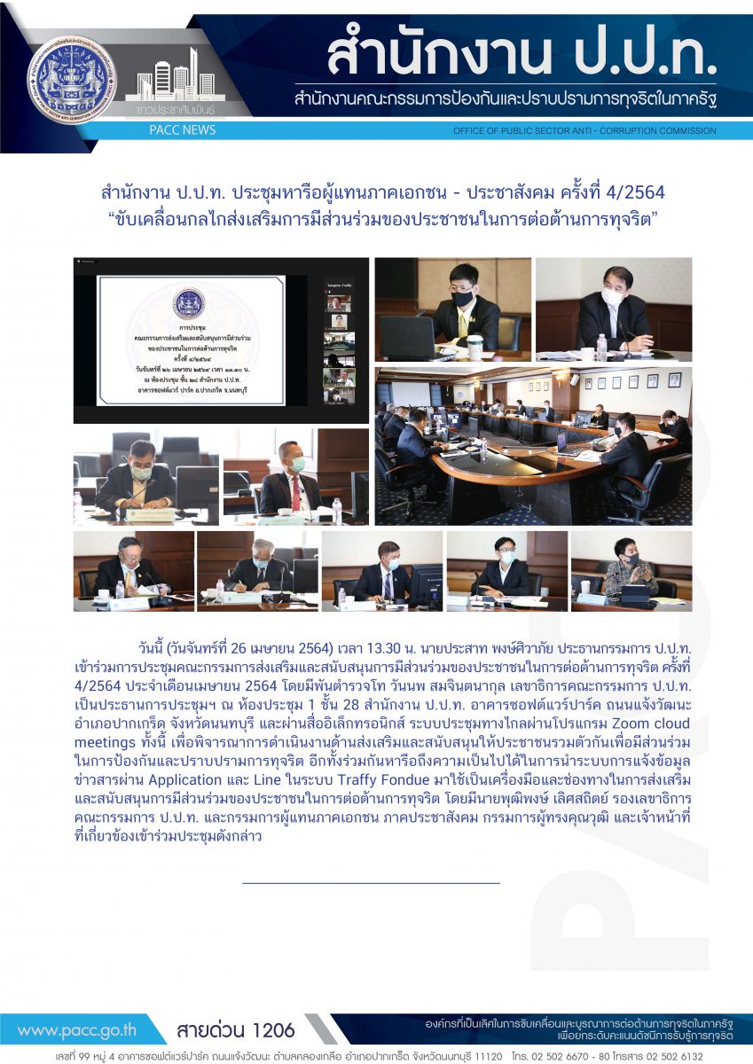 สำนักงาน ป.ป.ท. ประชุมหารือผู้แทนภาคเอกชน - ประชาสังคม ครั้งที่ 4/2564 "ขับเคลื่อนกลไกส่งเสริมการมีส่วนร่วมของประชาชนในการต่อต้านการทุจริต"