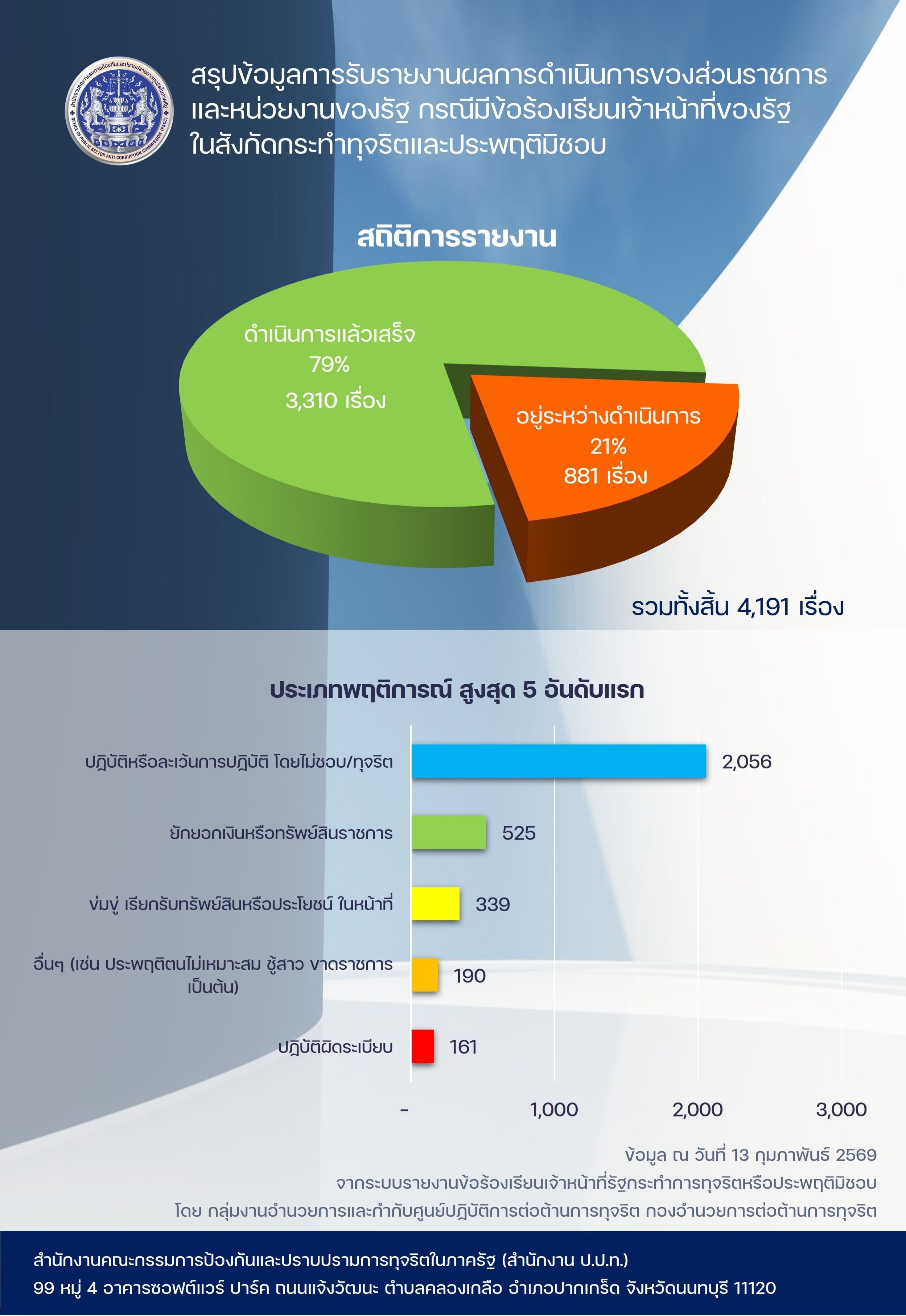 สรุปข้อมูลการรับรายงานผลการดำเนินการของส่วนราชการและหน่วยงานของรัฐ กรณีมีข้อร้องเรียนเจ้าหน้าที่ของรัฐในสังกัดกระทำทุจริตและประพฤติมิชอบ (ข้อมูล ณ วันที่ 13 ก.พ. 2569)