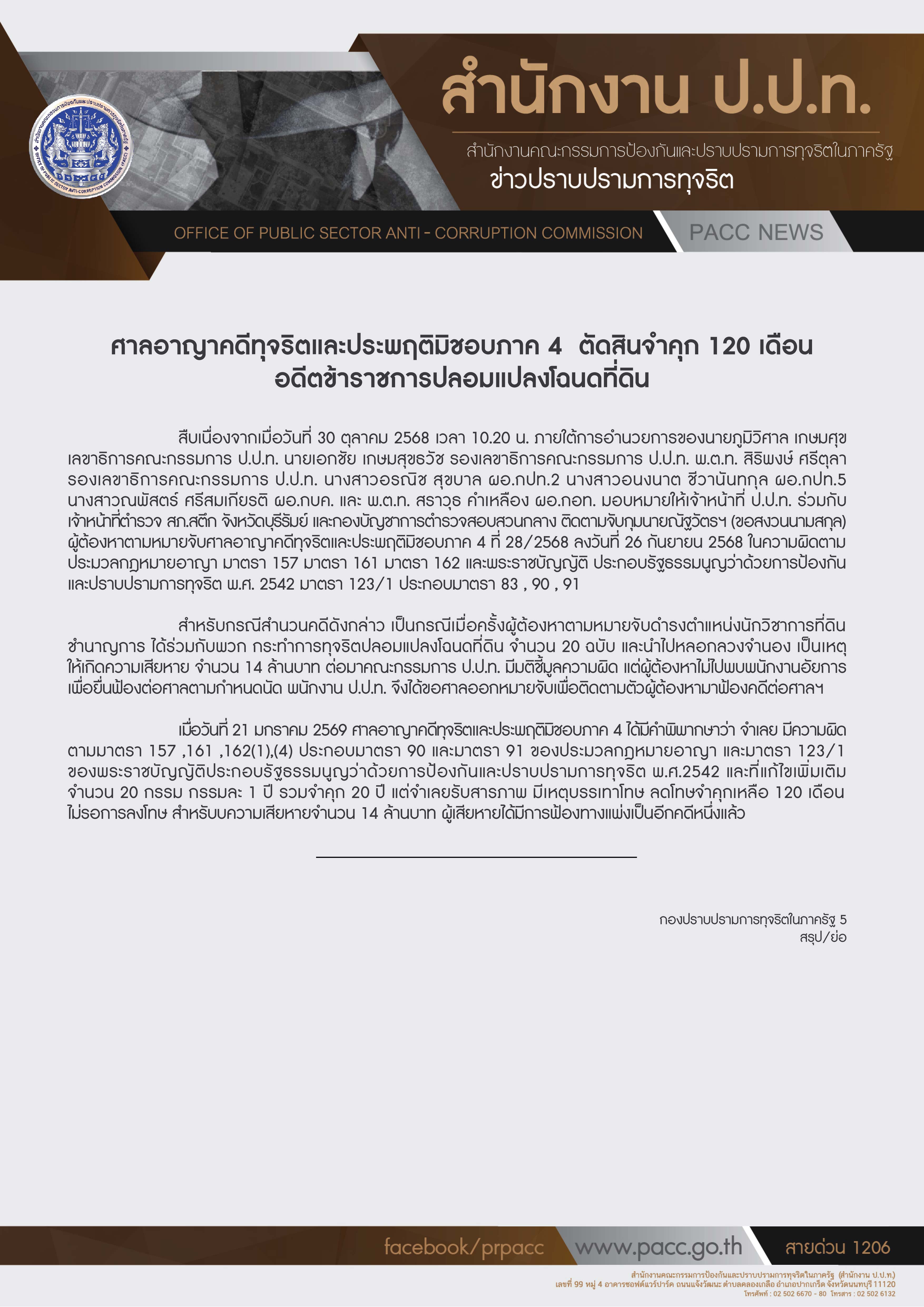 ศาลอาญาคดีทุจริตและประพฤติมิชอบภาค 4 ตัดสินจำคุก 120 เดือน อดีตข้าราชการปลอมแปลงโฉนดที่ดิน